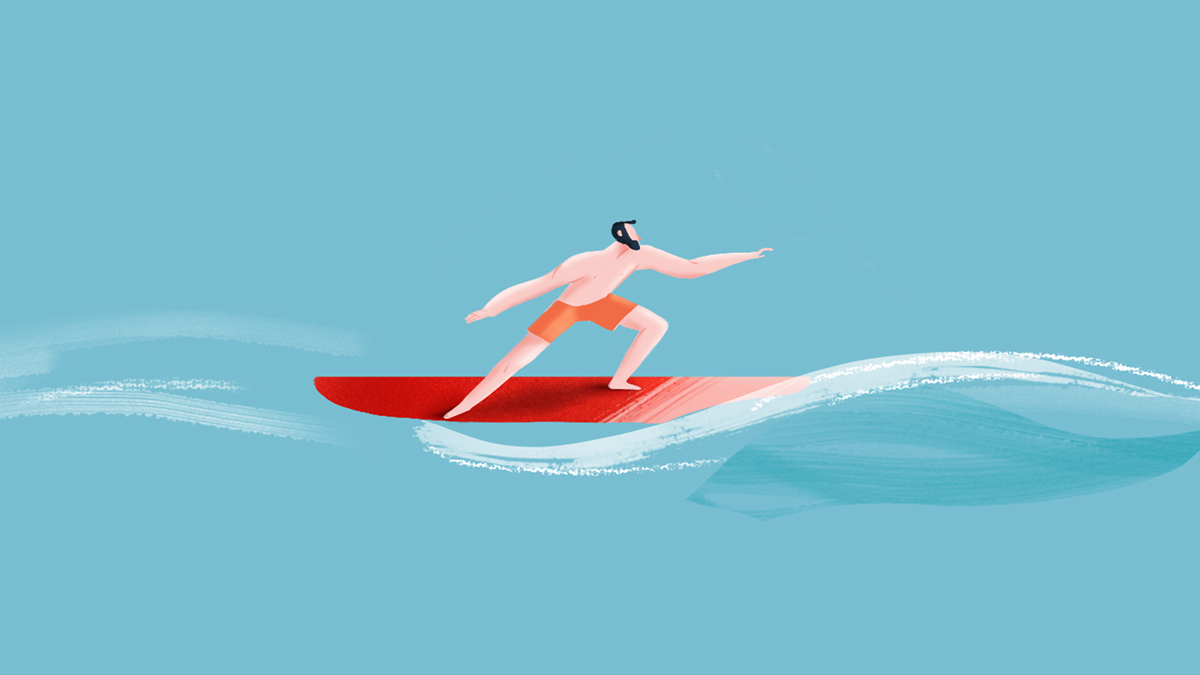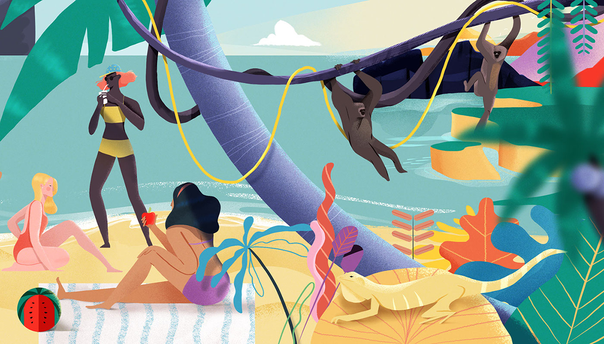 奋逗家族(fundog)每天会为您呈现丰富有趣的内容,例如:原创动漫IP、 动漫潮牌等。以下是来自以为美国的插画师绘制的海滩风景图,描绘的是一些在海滩上尽情游玩的游客们,有冲浪的、游泳的、日光浴的,到处的都是满眼的风景,一览无余。