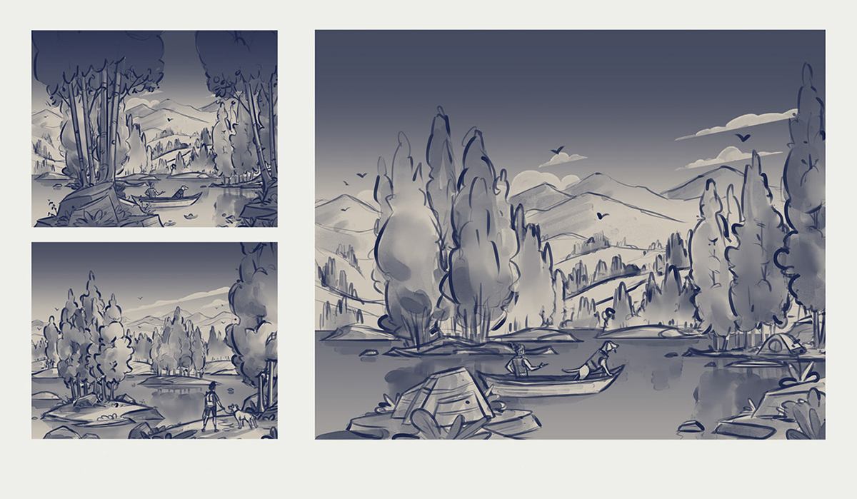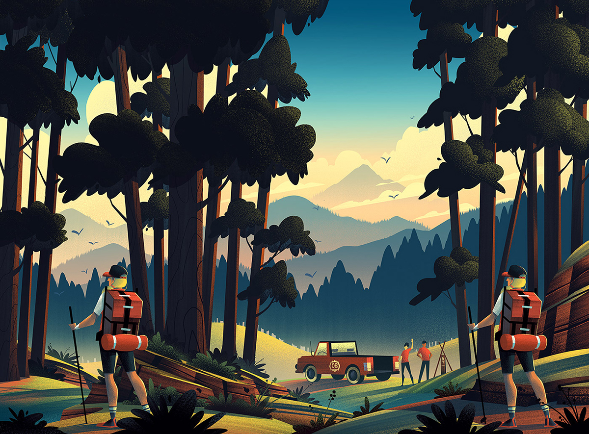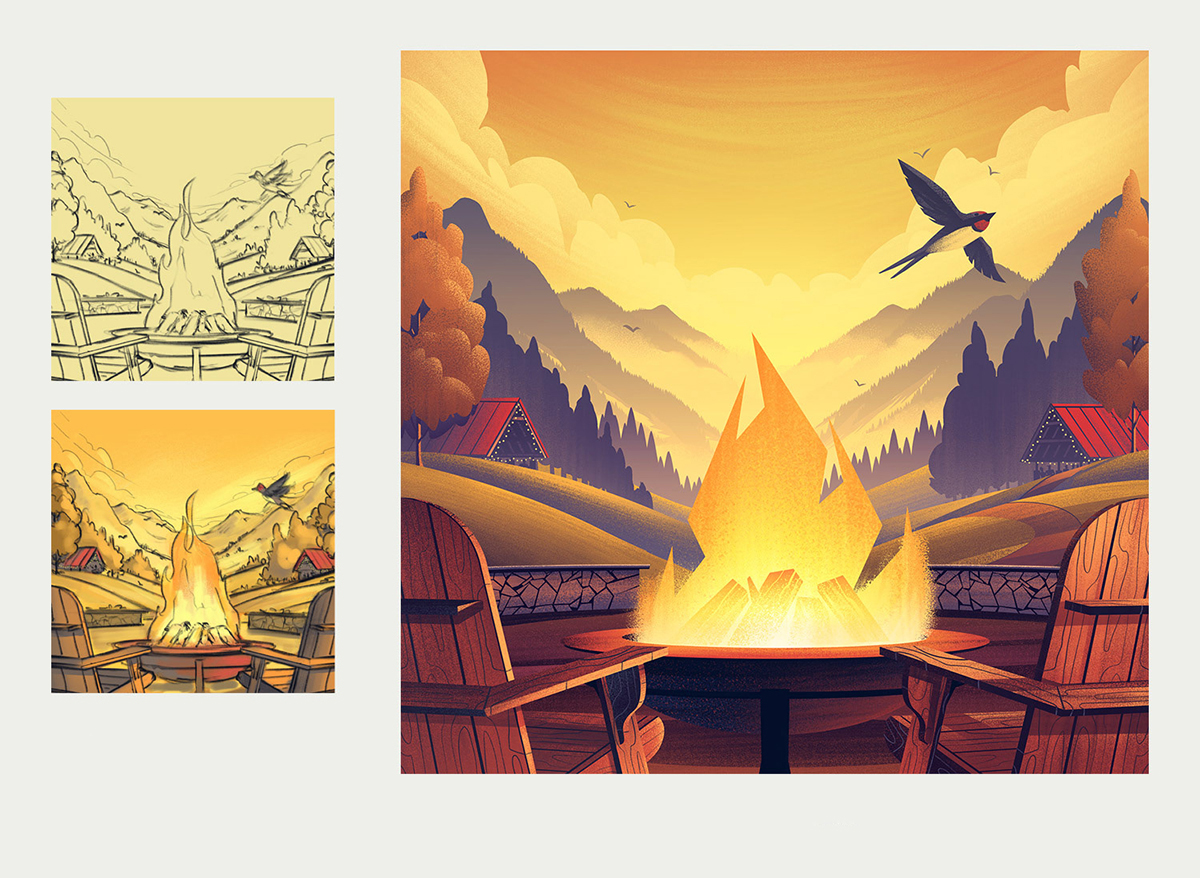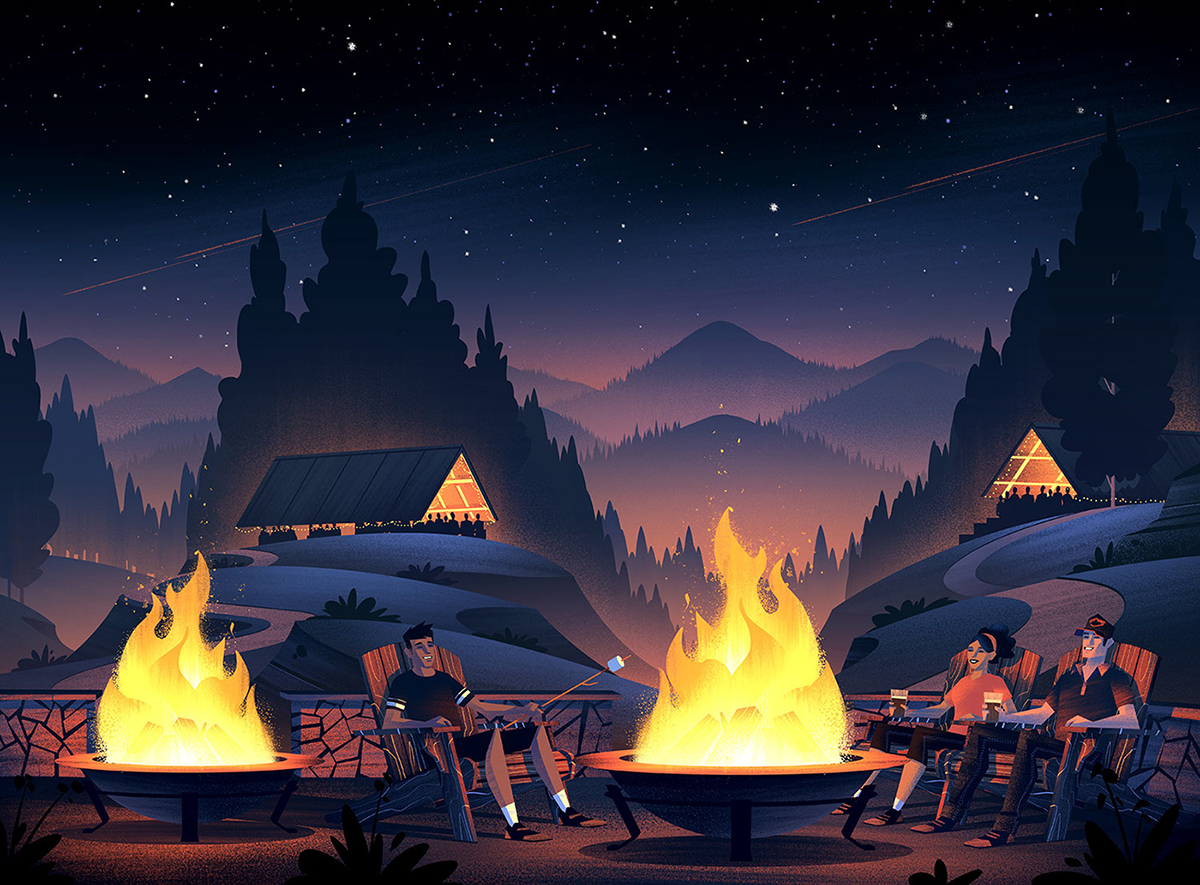今天带你一起欣赏“精酿啤酒厂插图的世界“,用插图和绘制的草图诉说了一个啤酒厂的故事。湖泊小船、落日余晖、连绵起伏的丘陵、山脉、树木和天空浑然一体,创造了一个漂亮的生活环境, 蓝色的天空带来温暖的夏季感觉, 徒步旅行者穿梭在树林中,冒险精神带给自己更多的勇气向前迈进,找寻回家的路??障械氖焙蚺笥衙蔷奂谝雇矶哑鸬幕鹂又芪В茸牌【?,畅想着接下来的生活、梦想,在火炉旁享受夜晚安静的时刻,在灯光的照耀下开怀大笑。