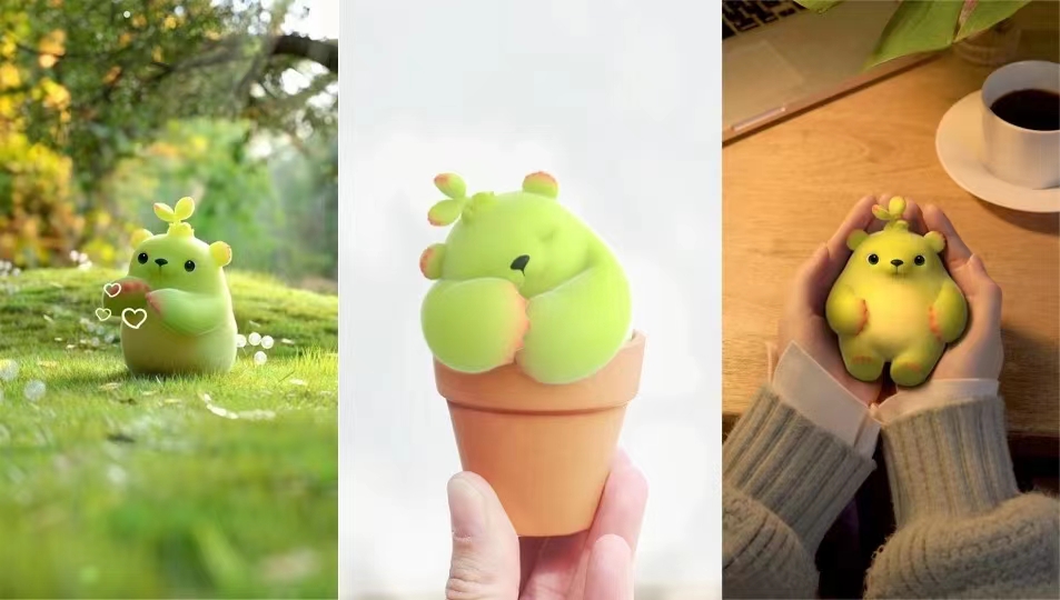 呆萌型情结的Ip形象还有很多,像近几年抖音上的网红萌芽熊的IP形象它其实是另外一种治愈型的呆萌IP形象,萌芽熊是一只从多肉植物中延生的小熊,它是多肉植物出身的植物系的萌宠,它看起来呆萌的,但是它却具有治愈型。我们来一起走进萌芽熊的故事体会一下它的萌中一定要着治愈温暖的关怀。